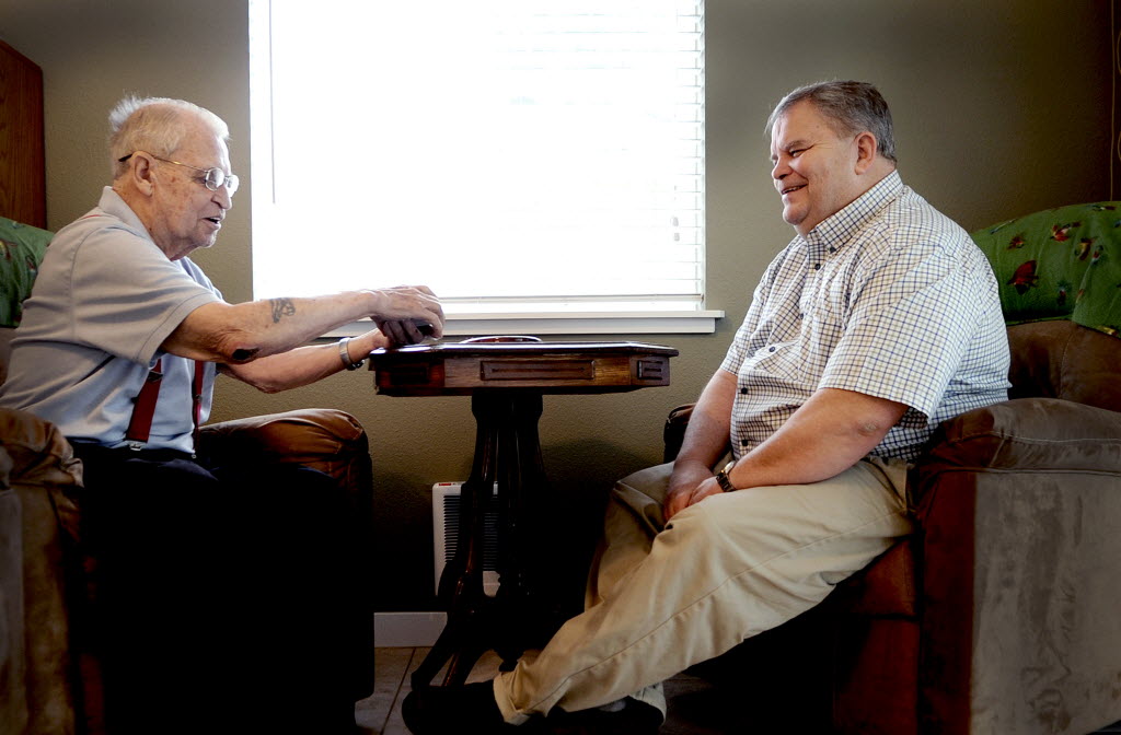 “We want to make it as warm and comfy as possible,” said George Cunningham, right of Bennett House as he played cribbage with Bob Nordby, left at the adult daycare facility in Coeur d’Alene on Thursday. The Bennett House, a cozy adult day care center that specializes in the needs of people with memory loss, including those with Alzheimer’s disease, and older adults who no longer can manage independently. Scott Maben SR story here. (SR photo: Kathy Plonka)