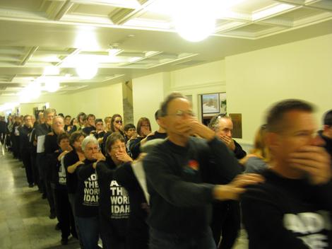 More than 100 “Add the Words” protesters, covering their mouths with their hands and carrying photocopied pictures of Ryan Zicha, a young gay Pocatello man who committed suicide in 2011 after being bullied at school, filed solemnly in two rows through the lower level of the state Capitol this afternoon. The protesters said they wanted lawmakers to see them; they paused and stood silently outside the hearing rooms where Senate committees are meeting this afternoon, before filing back through to the House side/ Betsy Russell , Eye on Boise. More here.