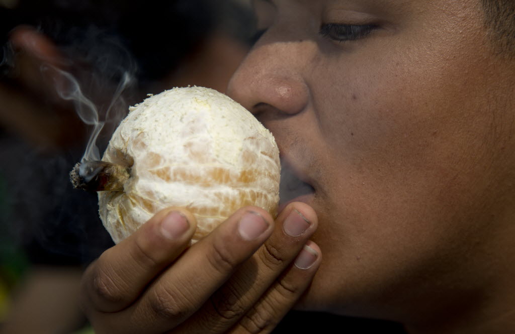 A man smokes marijuana using an orange as a holder during a demonstration in favor of legalizing marijuana outside the Senate in Mexico City on Tuesday. You write the cutline. (AP Photo/Eduardo Verdugo)