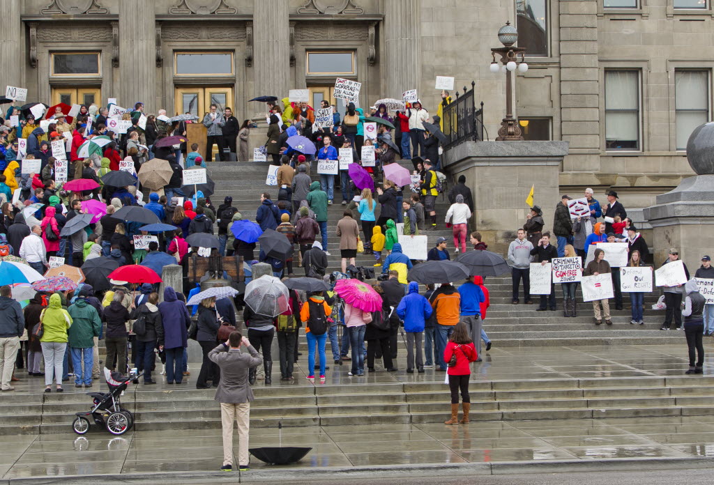 About 300 people gather on the steps of the Idaho Statehouse in Boise, Idaho to protest SB1254, a bill seeking to allow concealed weapons on the state’s college campuses today. (AP Photo/The Idaho Statesman, Darin Oswald)