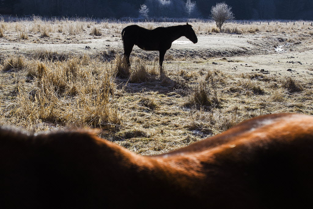 A pair of horses soak up the sun in a frosty pasture Nettleton Gulch Road in Coeur d’Alene on Monday. Temperatures in North Idaho dipped into the teens over night. (Coeur d’Alene Press photo: Shawn Gust)