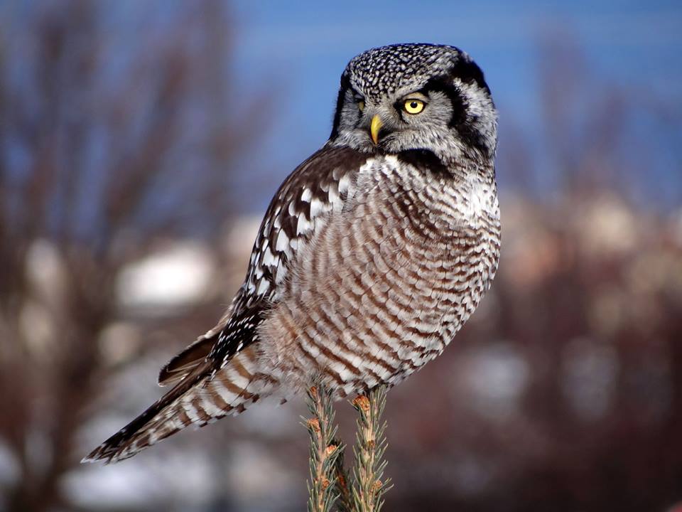 Because of their remote habitat zones, “northern hawk owls are challenging to study and we know far less about them than we do most birds of North America,” she said. “So now you’ve got one perched on a traffic sign near a shopping mall? I wish I could be there.”