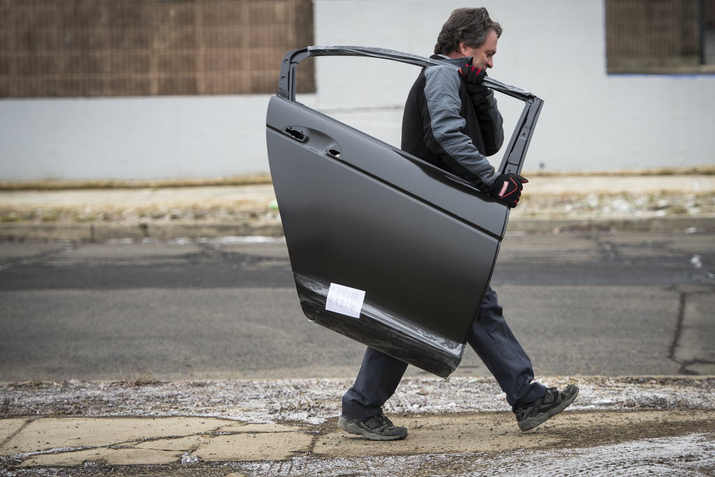 “It would be a whole lot easier to drive if the rest of the car was attached,” said Alan Eaton, an estimator with Custom Body on North Monroe Street in Spokane, while walking a customer’s 2009 Honda Accord door frame over to Pat’s Frame Shop two blocks away. You write the cutline. (SR photo: Colin Mulvany)