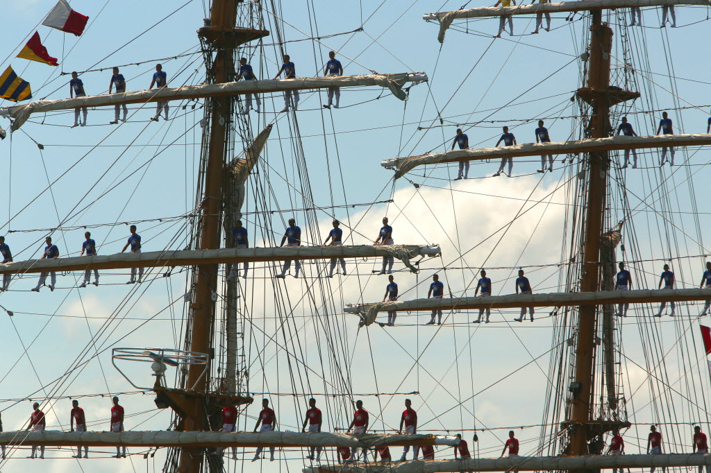 The ARC Gloria, official flagship of the Colombian Navy, docks at the Tampa Convention Center on Monday in Tampa, Fla. The ship is traveling around the world to introduce people to the South American country, the Tampa Bay Times reported. The three-mast sailing vessel boasts 23 sails and one of the largest Colombian flags in the world. The ship will be in Tampa until Thursday, when it is scheduled to set sail to Miami. (AP Photo/The Tampa Bay Times, Skip O’Rourke)