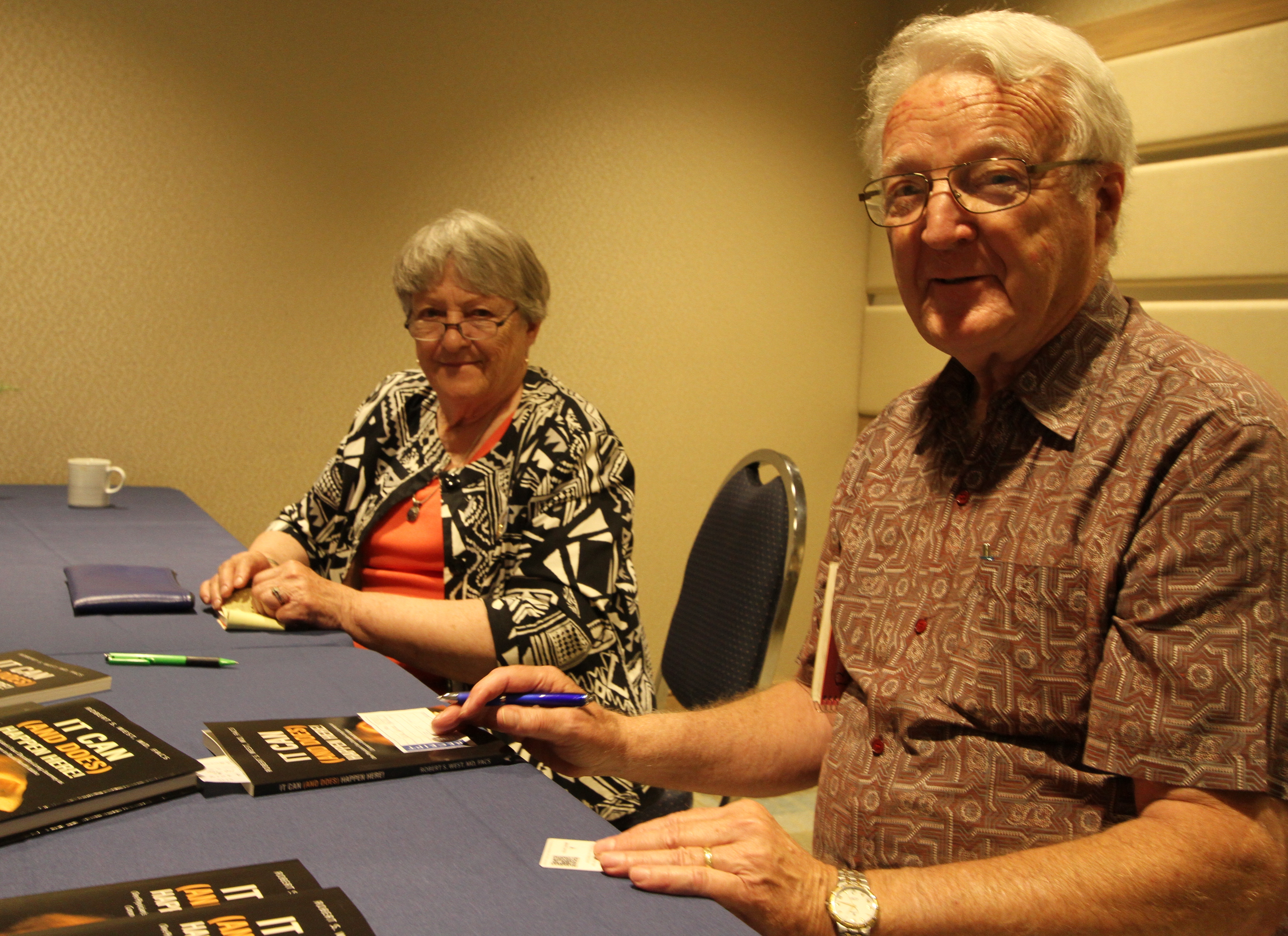 Former Kootenai County coroner Bob West and his wife, Martha, were on hand at the Kootenai County Republican Women’s luncheon today to sign the doctor’s book, “It Can (And Does) Happen Here.” West was the guest speaker. (Photo: Duane Rasmussen)