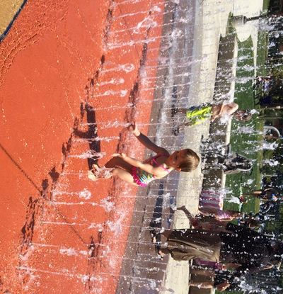 Mary Woodings, 3, daughter of Secretary of State candidate Holli Woodings, plays at the splash pad at the new McEuen Park earlier this afternoon in Coeur d’Alene. The Democratic candidate promised her daughter in an earlier visit that she could play at the popular splash pad if the weather was nice next time they traveled to the Coeur d’Alene area. It was today.
