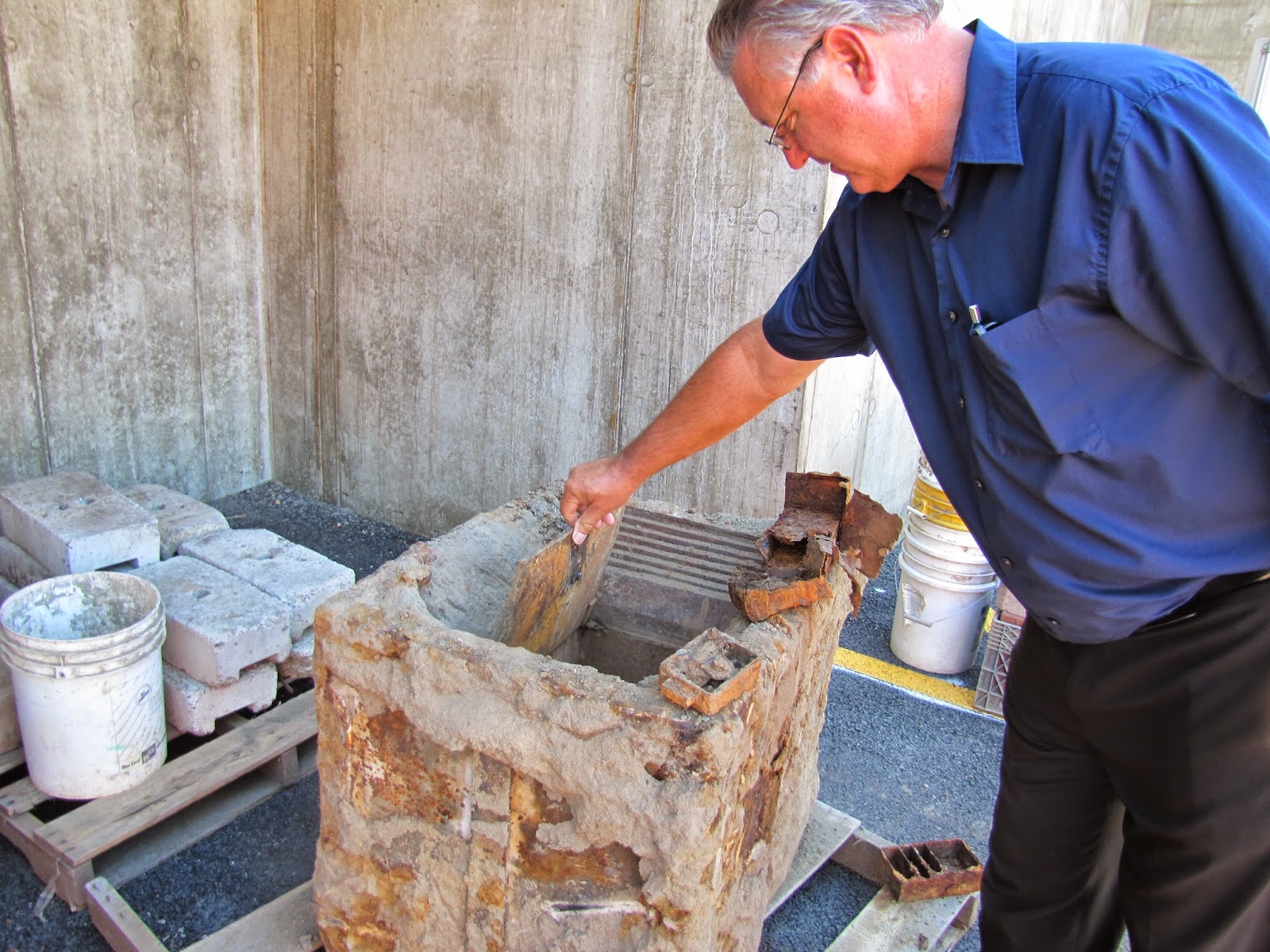 Bryan Taylor of Contractors Northwest Inc., examines the safe uncovered at McEuen Park this week. (Coeur d’Alene Today photo: Keith Erickson)