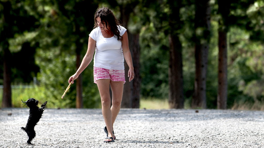 “She thinks she’s a Labrador,” said Summer Eddings of Hayden, Iaho as she walks with Ellie, her Teacup Poodle in Hayden earlier today. (AP Photo/The Spokesman-Review, Kathy Plonka)