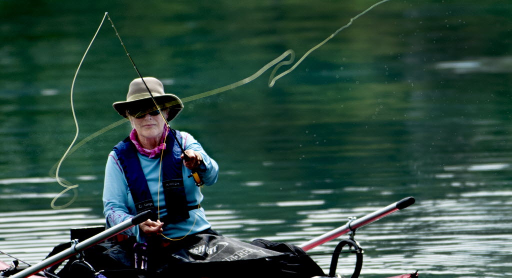 Joanie Dwyer of Coeur d’Alene fly-fished from her pontoon on Hayden Lake on Monday. (SR photo: Kathy Plonka)