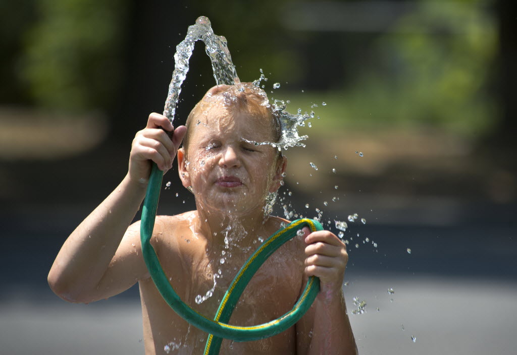After returning from a morning summer camp, Gabe Frye, 8, splashes himself in some cool water from a garden hose as he fills the family’s front-yard swimming pool today in Spokane. Temperatures are expected to approach 100 degrees on Wednesday. (SR photo: Dan Pelle)