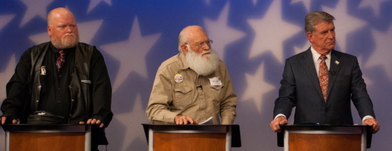 At the infamous May 15 Idaho GOP gubernatorial debate, Harley Brown, far left, Walt Byers, center, and Gov. Butch Otter listen to a question posed by a panelist. (File photo: Idaho Public Television)