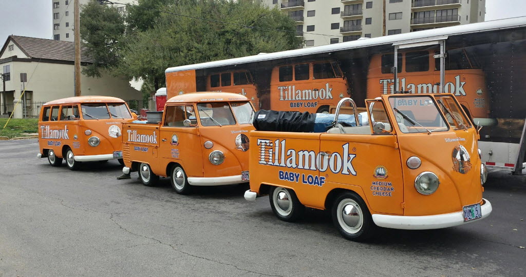 In this undated photo provided by the Manteca (Calif.) Police Department are three Tillamook Cheese vans that were stolen Saturday, July 12. Police in Central California are searching for three bright orange Tillamook cheese vans that were stolen over the weekend. Manteca police say the restored Volkswagen minibuses, worth $100,000 each, vanished early Saturday from a hotel parking lot. They were secured in a trailer pulled by a Ford F-350 pickup that also painted orange. Police say the minivans had stopped in Manteca on a tour promoting the Oregon-based Tillamook County Creamery Association’s dairy products. Story here . (AP Photo/Manteca Police Dept.)