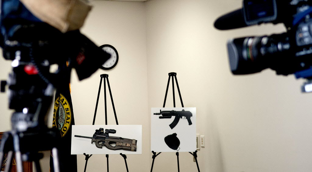 An FN 5.7 carbine rifle with a 50-round magazine, left and an AK-47 with a high-capacity drum magazine were found in Marcus A. Rael’s possession after the Arizona man was injured during a gun battle with North Idaho police on Interstate 90 last month. Rael fired first with one of the two semi-automatic weapons in his possession. He is being held at the Kootenai County jail on $1 million bond. (SR photo: Kathy Plonka)