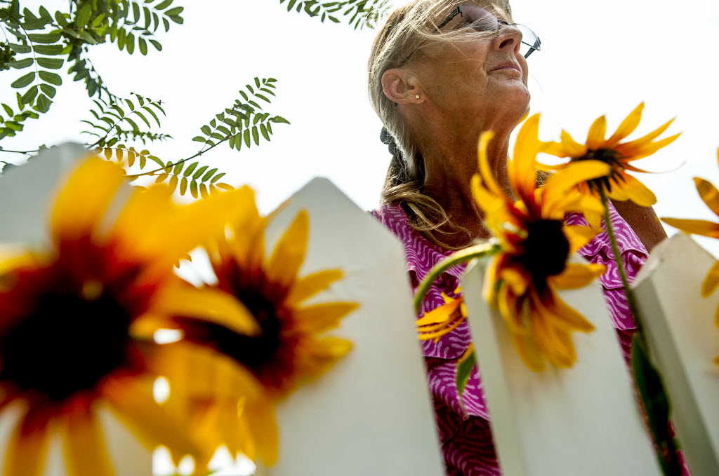 “They get wilder every year,” said Patty Larson as she tied back the Shasta daisies at her home in Coeur d’Alene today. (SR photo: Kathy Plonka)