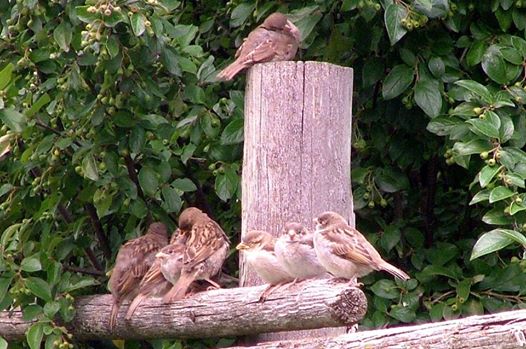 On her Facebook wall , Kerri Thoreson posts: ” Flight School Saturday for at least a dozen of our resident sparrow fledglings. They’ve been practicing flying from trees to feeder to fence rail. They also hop about on the front sidewalk and look for bugs in the grass. Their parents keep an eye on them from afar. I enjoy watching the circle of life unfolding right outside the window.”