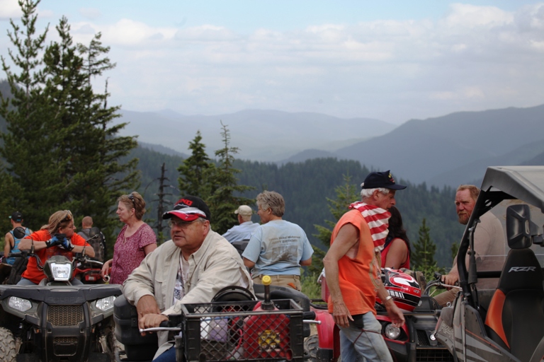 During the weekend, 24 machines in the local Four Wheeler Club pause during a trip covering about 90 miles from Wallace south to Avery and back again. Dave Lyda, who owns the North Idaho Trophy Company is in the foreground wearing a black, white and red baseball hat. The route followed the Slate Creek drainage to the St. Joe River Ranger Station and through several train tunnels near Avery before returning to Wallace. (Photo: Duane Rasmussen)
