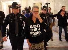 (AP file photo: Nicole LeFavour is arrested after blocking the entrance of the Senate chambers at the Idaho Statehouse Feb. 3 in Boise)
