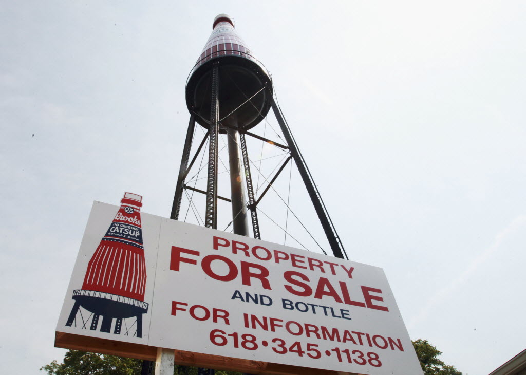 A “For Sale” sign is seen Tuesday in front of what’s billed as the “World’s Largest Bottle of Catsup” that once served as a water tower in the city of Collinsville, Ill. The landmark replicates a bottle of Brooks Old Original Rich and Tangy Catsup, which was produced in the buildings beneath the tower. The 100,000-gallon tower held water _ never ketchup _ and hasn’t been used since Brooks moved out in the early 1960s. (AP Photo/Belleville News-Democrat, Derik Holtmann)