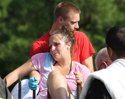 A passerby holds up a woman after her leg became impaled on a fence at Vine Street Cemetery in Hazleton, Pa., on Tuesday. Firefighters had to cut a section of the fence around her leg. The woman was taken to Lehigh Valley Hospital-Hazleton with part of the fence remaining in her leg. Story here. (AP Photo/Standard-Speaker, Jamie Pesotine)
