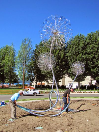 Coeur d’Alene recreation director Steve Anthony, left, and artist David Tonnenson install Allium Spring Chorus. (Photo: Coeur d’Alene Today)