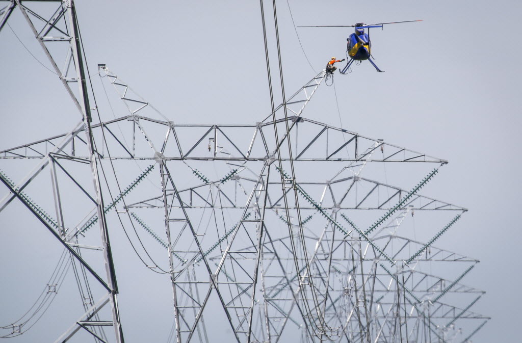 A lineman reaches for a lift from a helicopter as work continues on twinning power lines that run from Calgary to Edmonton near Carstairs, Alta., Wednesday. (AP Photo/The Canadian Press, Jeff McIntosh)