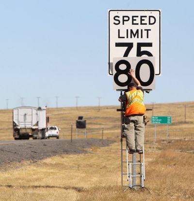 Kevin Daughdrill (in front of sign) and Eric Allen (behind sign) of the Idaho Transportation Department affix new speed limit signs along the westbound lanes of Interstate 84 east of Mountain Home today. (AP Photo/Idaho Statesman: Joe Jaszewski)