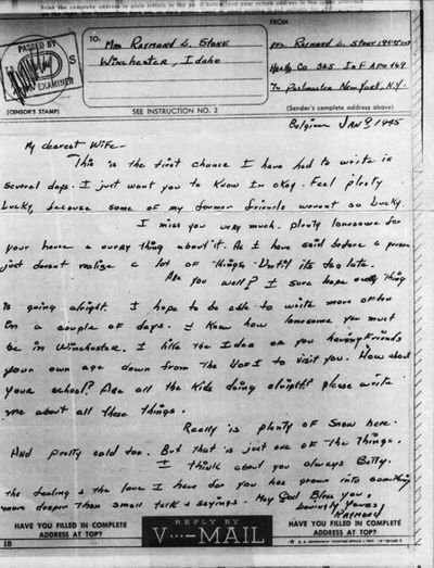 DFO: The letter former Coeur d’Alene mayor Ray Stone sent home to his wife, Betty, during the Battle of the Bulge is one of the many items featured on Cindy Hval’s “War Bonds: Love Stories from the Greatest Generation” Facebook page. You can become a follower of Cindy’s page by clicking here.