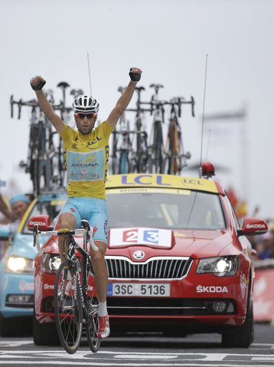 Italy’s Vincenzo Nibali crosses the finish line to win the eighteenth stage of the Tour de France cycling race over 145.5 kilometers (90.4 miles) with start in Pau and finish in Hautacam, Pyrenees region, France, earlier today. (AP Photo/Laurent Cipriani)