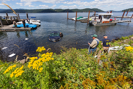 Tim McCall, a diver with Tom’s Diving Adventures helps tow crews to direct a car toward the shore in Gotham Bay. More here. (Coeur d’Alene Press photo: Mike Curry)