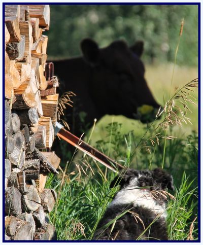 Miss Kea, a border collie owned by Marianne Love/Slight Detour, corners a short-horned, neighbor’s cow near a wood pile on the Lovestead. Eventually, the collie escorted the bovine back to her place. You can read all about it & see more photos here .