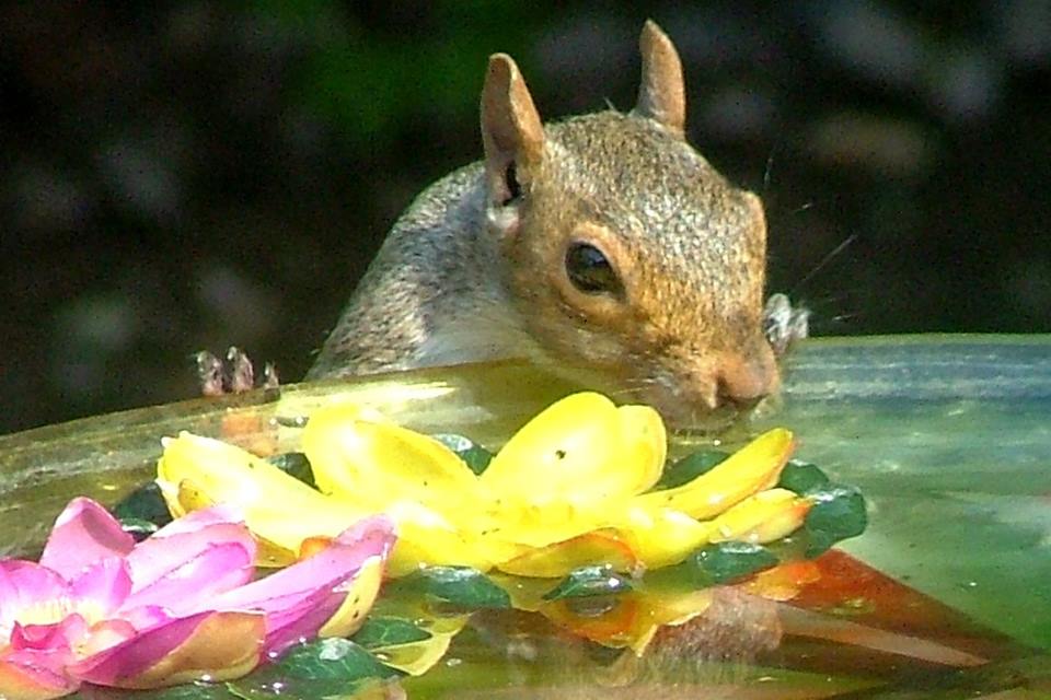 A squirrel in Kerri Thoreson’s back yard enjoys a drink from a fountain.