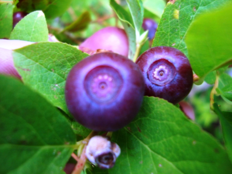 That purple thumb above belongs to Walkabout, who is using it to demonstrate the size of the huckleberries that she’s picking this year..