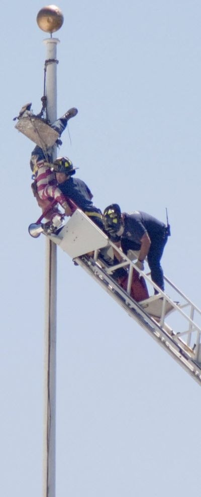 Yakima Fire Department firefighters rescue Warren Hinrichs who passed out while working on the flag pole atop the William O. Douglas Federal Courthouse in downtown Yakima Monday. (AP/Yakima Herald-Republic: Donald W. Meyers)