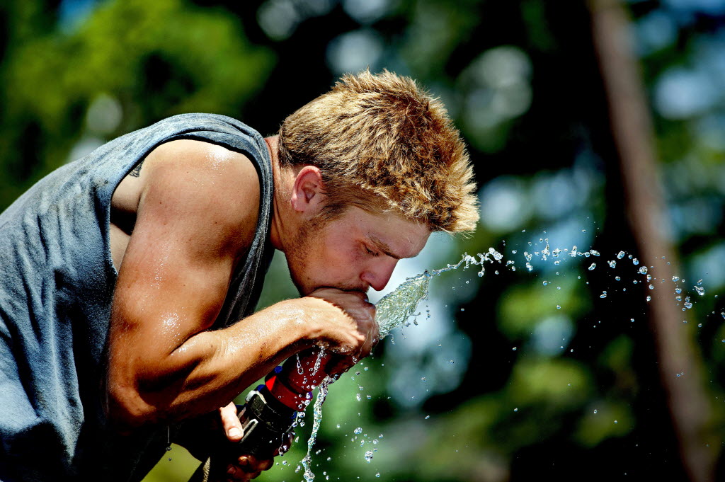 Kameron Freiday takes a drink from a hose while battling temperatures in the high 90s as he laid pipe on a construction project in Coeur d’Alene today. (SR photo: Kathy Plonka)