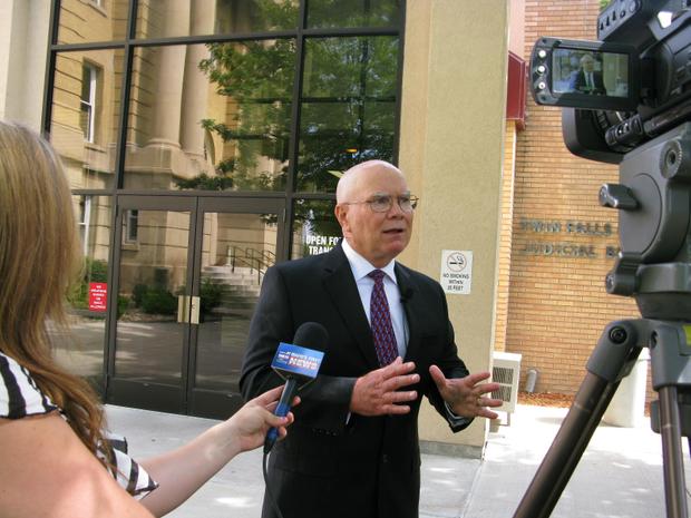 Christ Troupis talks with reporters outside the Twin Falls county courthouse on Tuesday. “We don’t want to preserve a conflict,” he said, noting that no appeals were contemplated. Troupis, who unsuccessfully challenged GOP Attorney General Lawrence Wasden in the primary this year, said the party needs to unify. Reaction to judge’s ruling here . (SR photo: Betsy Russell)