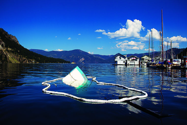 After an explosion on board, a Tollycraft cabin cruiser boat rests, half-submerged in Lake Pend Oreille. A 70YO man and his 8YO grandson escaped w/2nd degree burns on their legs. Story here. (Coeur d’Alene Press photo: Mike Curry)