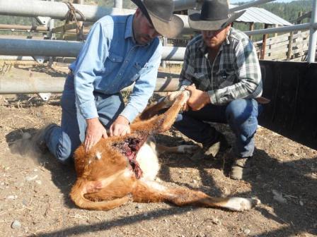 Cowboys examine a calf they say was severely injured by wolves, latest in a series of wolf attacks on Diamond M Ranch cattle since mid July. (Stevens County Cattlemen’s Association)