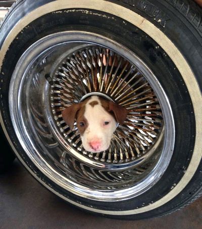 A puppy that somehow got his head stuck in the middle of a wheel rim is shown after being brought to a Kern County, Calif., fire station on Friday, June 20. Fire Department spokesman Brandon Hill says two firefighters used vegetable oil to ease the dog’s head out of the hole. The little pooch, named Junior, has returned to live with its owner and seven siblings. You write the cutline. (AP Photo/James C. Dowell )