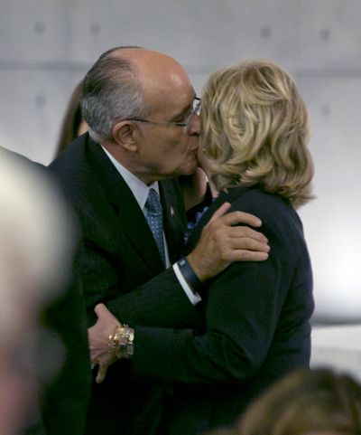 Former New York Mayor Rudolph Giuliani greets Hillary Rodham Clinton after the dedication ceremony in Foundation Hall, of the National September 11 Memorial Museum, in New York, Thursday. You write the cutliine. (AP Photo/Richard Drew/POOL)