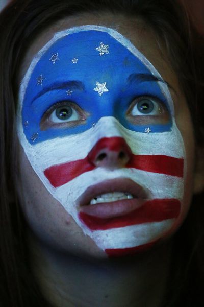 A fan, with her face painted with the U.S. national soccer team’s colors, watches a live telecast of the group G World Cup match between United States and Portugal, inside the FIFA Fan Fest area on Copacabana beach, in Rio de Janeiro, Brazil, Sunday. The United States is playing Germany this morning with a chance to move on to the next round. (AP Photo/Leo Correa)