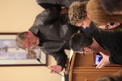At the Coeur d’Alene School Board meeting Monday night, Coeur d’Alene attorney Susan Moss listens as Tim Scott claims that two Coeur d’Alene trustees had lied when they said in the past that they weren’t having discussions with members of the LGBT community. A public records request revealed two instances where Chairman Tom Hearn had exchanged emails with members of the LGBT community. Trustee Christa Hazel said Scott and John Padulla of Set Apart Discipleship were mischaracterizing the situation. (Photo: Duane Rasmussen)