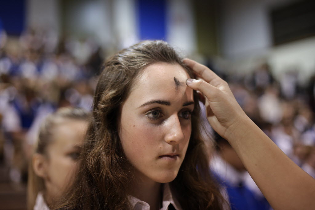 Madeline McFadden, 14, receives ashes on her forehead during an Ash Wednesday Mass at Santa Margarita Catholic High School in Rancho Santa Margarita, Calif.. today. Ash Wednesday marks the beginning of the Lenten season, a time when Christians commit to acts of penitence and prayer in preparation for Easter Sunday. (AP Photo/Jae C. Hong)