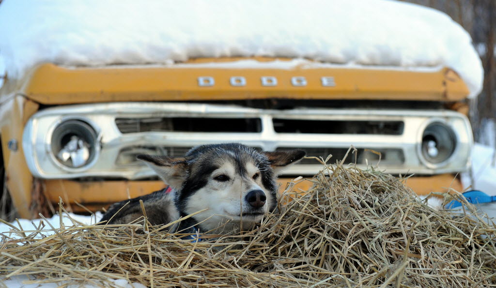 A dog that belongs to Ralph Johannessen, from Dagali, Norway, rests on a bed of straw at the Takotna, Alaska checkpoint during the Iditarod Trail Sled Dog Race on Thursday. (AP Photo/The Anchorage Daily News, Bob Hallinen)