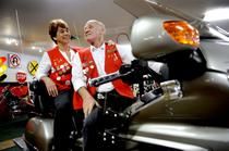 (SR photo by Kathy Plonka: Lilac City Wings chapter directors Mary Grose and Wally Youmans talk about the club while sitting on a 2006 Gold Wing at Coeur d’Alene Honda)