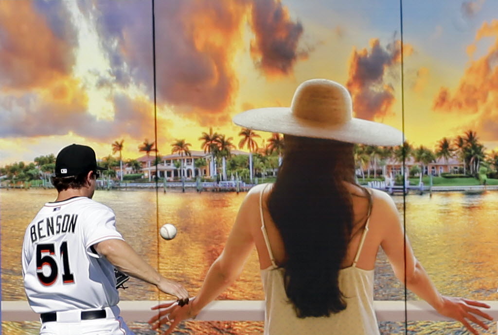 Miami Marlins center fielder Joe Benson chases a ball as it is hit off a real estate advertisement on an outfield wall for an RBI-double by Houston Astros’ J.D. Martinez during the seventh inning of an exhibition spring training baseball game Monday in Jupiter, Fla. You write the cutline. (AP Photo/Jeff Roberson, File)