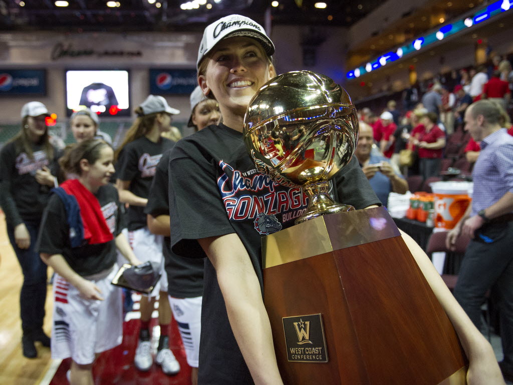 Gonzaga Bulldogs guard Elle Tinkle (31) carries the WCC championship trophy off the court last Tuesday in Las Vegas, Nev. Six-seed Gonzaga will face James Madison in the opening round of the NCAA tourney. Meanwhile, No. 14 Idaho has drawn No. 3 Louisville. See stories below. (SR file photo: Colin Mulvany)