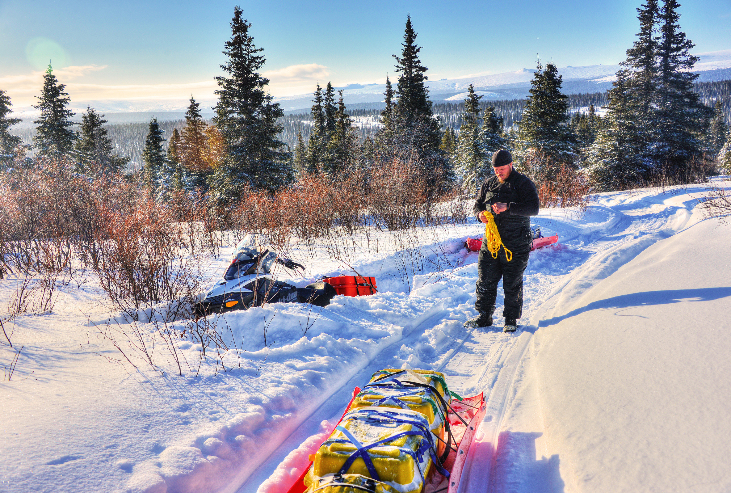 I flipped my machine onto it’s side for the second time today.  And Josh rode off the trail into about 4-feet of powder snow and was instantly stuck to the top of his seat.  I was still on the hard-packed trail, so Josh got out a section of rope and we got hooked up.  On the third run his machine was back onto the trail.  He put the rope away, hooked up his sled, and we were off for Elim.