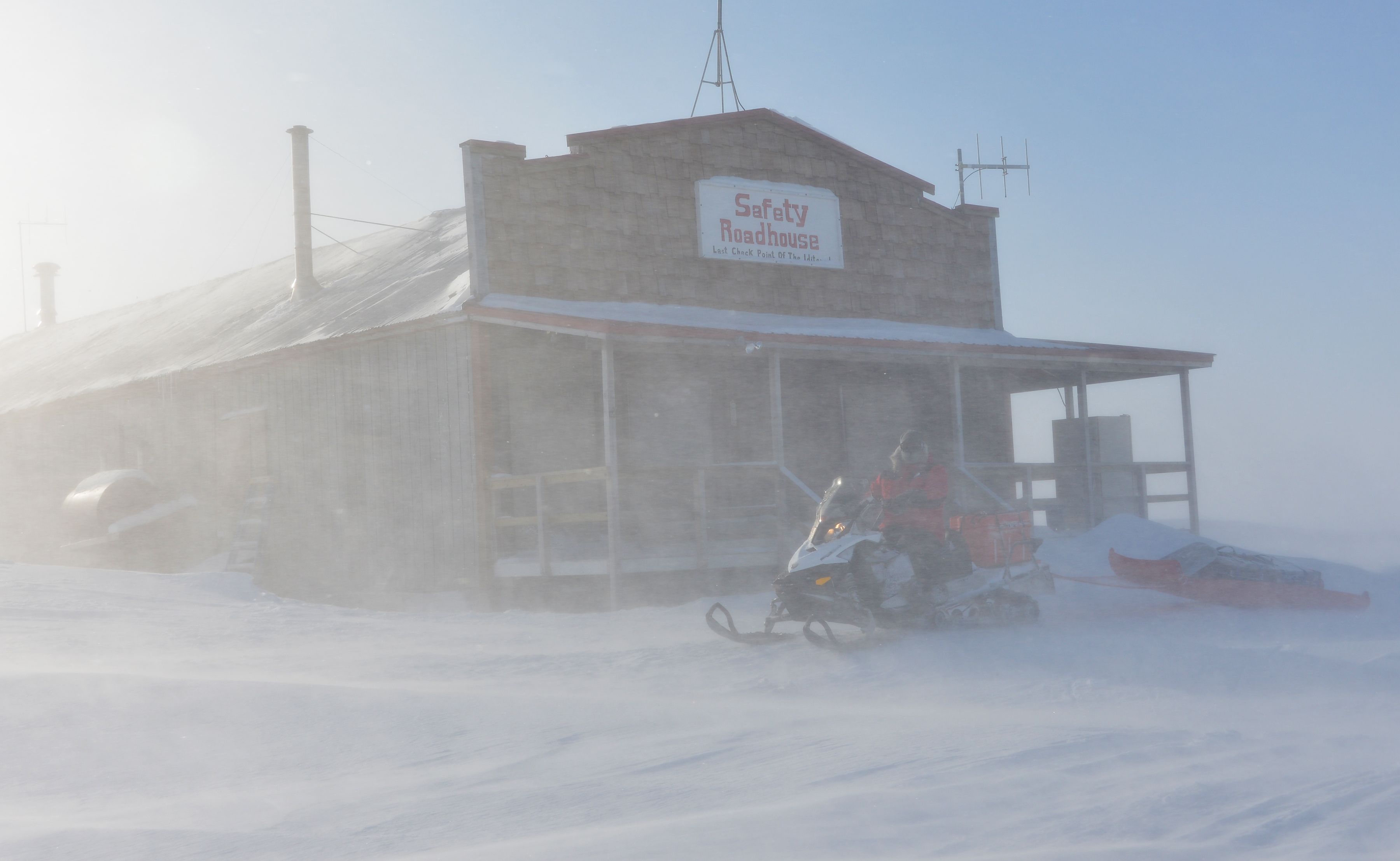 We made Safety OK.  And we talked the situation over.  In normal times, the stretch of trail that lie ahead can be the most dangerous section all the way from Knik to Nome.  Snow blowing from land to the north towards the sea to the south can and does create periods of total whiteout.  Snow machine carburators can fill with micoscopic particles of snow smaller than a piece of flour, and cut off the air supply to the engine.  It is no place to have a dead machine in a ground-blizzard!