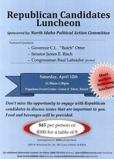 Earlier today, I published an invite to the annual Lincoln Day Dinner on Saturday, April 12, circulated by the Kootenai County Republican Central Committee. The dinner will feature Gov. Butch Otter and his main challenger, state Sen. Russ Fulcher. Now, I’ve obtained a flyer for the rival luncheon that will take place earlier in the day at the Hagadone Event Center, featuring Gov. Otter and U.S. Sen. Jim Risch, R-Idaho. The event is sponsored the North Idaho Political Action Committee. You can see times and ticket prices above.