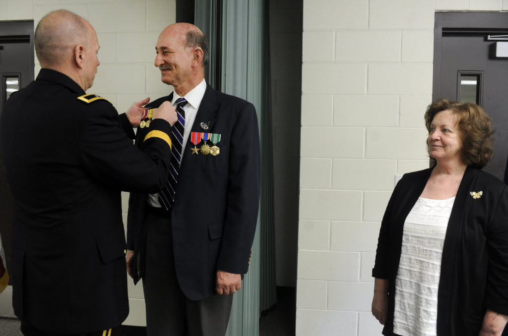 Vietnam veteran Leon Strigotte, left, receives medals and commendations he earned in Vietnam in 1969 from Brigadier General John Goodale of the Idaho Army National Guard at the Post Falls National Guard Armory in Post Falls today. Strigotte’s wife, Linda, watches at right, Leon received long-overdue medals from his Vietnam service Friday. Story below. (SR photo: Jesse Tinsley)